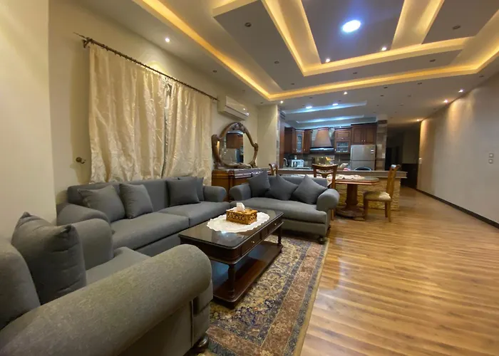 Enjoy the convenience of an equipped kitchen in Spacious Ground-Floor Apartment New Cairo, allowing guests to prepare their own homemade meals. The nearest airport is Cairo International airport, 5 km from Spacious Ground-Floor Apartment New Cairo in Cairo.